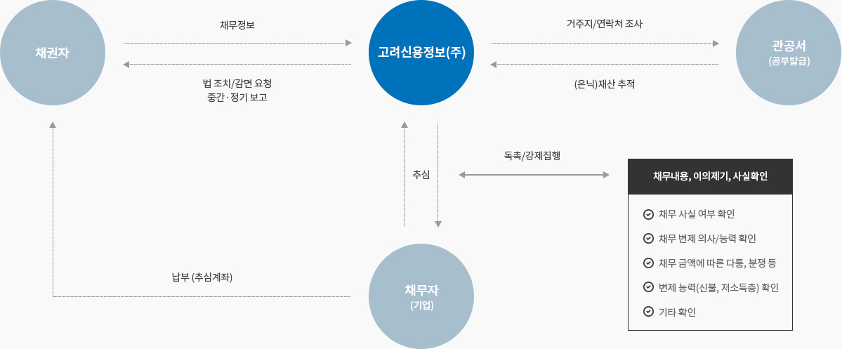 업체 최초 채권추심업을 취득한 중견기업으로 아래와 같은 서비스를 제공합니다.